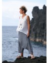 Mini Top déstructuré en voile de lin blanc "Vésuve" accompagné d' un pantalon sarouel ADRIEN RAYÉ en lin bleu "jean" à fines rayures ficelle. Taille élastiquée au creux du dos,zip invisible sur la hanche. Un must ! Aussi confortable (et addictif !) que votre jean préféré !!