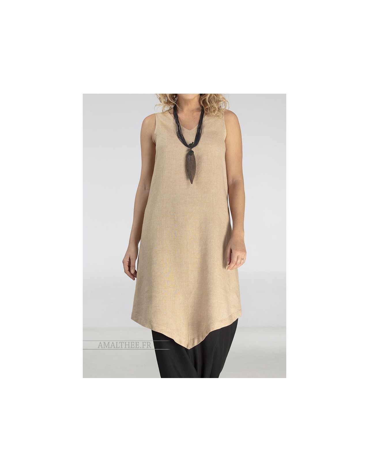 Sans manches, tunique avec une forme géométrique se terminant en pointe , ce qui affine et grandit la silhouette.