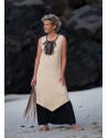 TUNIQUE LOSANGE en pur lin chambray (beige ambré) col V , coupée en pointe devant, bord droit au bas du dos entièrement zippé, accompagnée d'un sarouel jupe noir en lin/viscose, taille élastiquée dans le creux du dos. (voir descriptif détaillé du collier dans notre rubrique "bijoux")