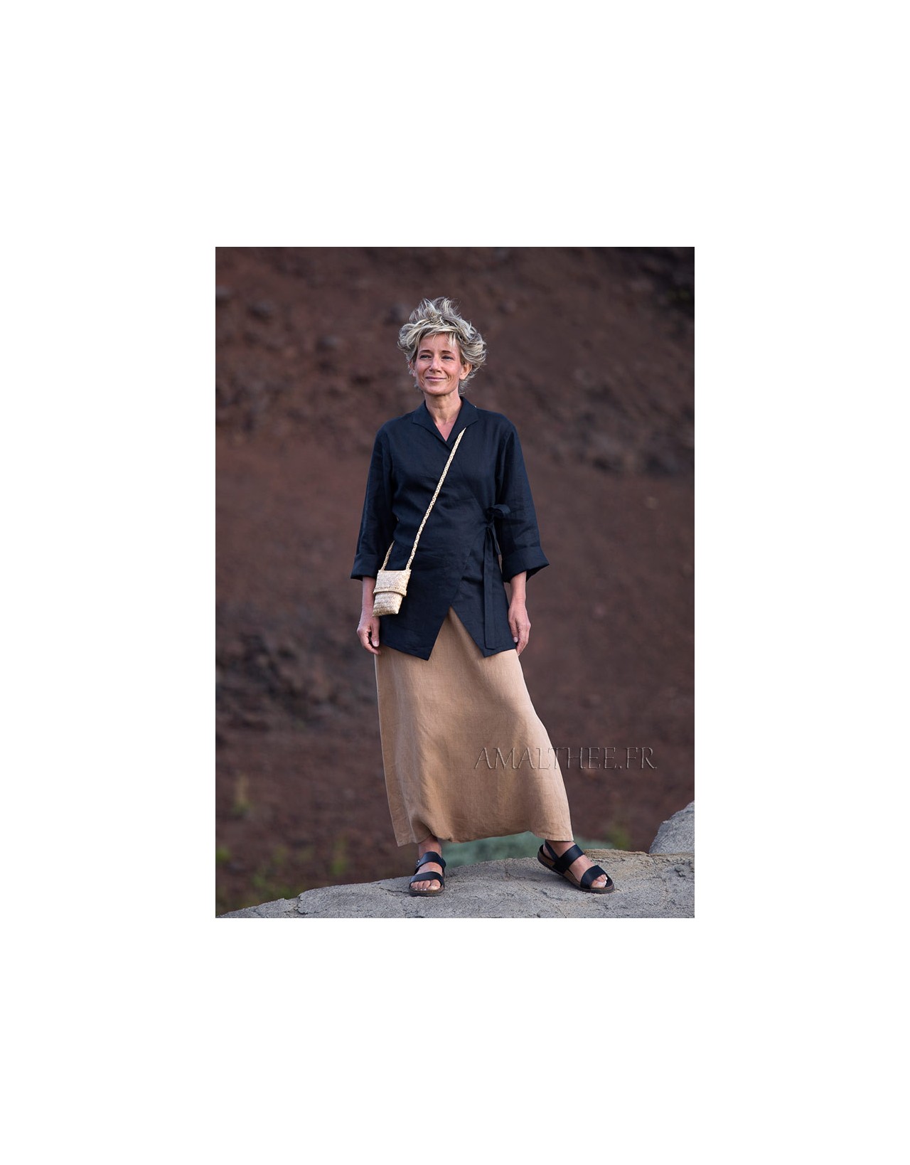 Rigueur Japonisante ou décontraction stylée : à vous de jouer ! Veste KIMO en lin noir, manches longues, coupe croisée nouée façon "cache-coeur", grande poche plaquée. A porter en mi-saison sur un pull fin. ou comme ici dans sa version estivale à même la peau, manches retroussées "façon chemise.